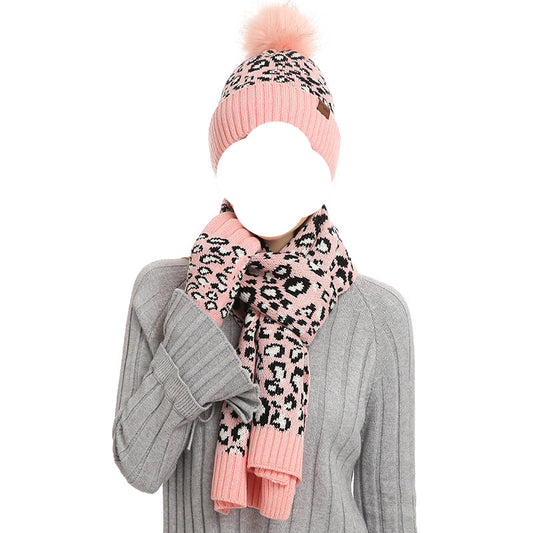 Pink Women's Leopard Print Winter Warm Knit Set - 3 Piece Fleece Lined Hat, Scarf & Gloves
