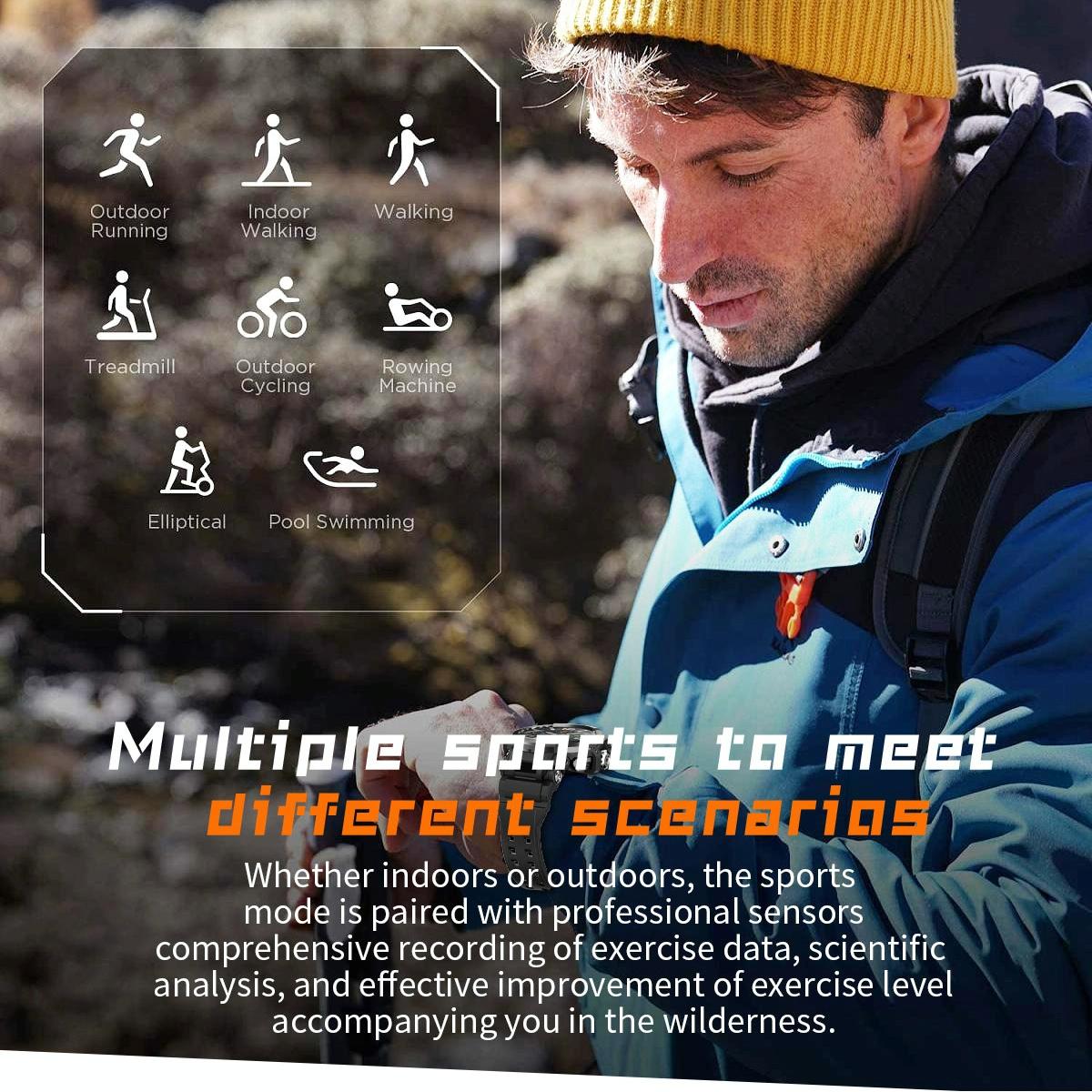 • Main functions include step count, sleep tracking, heart rate monitoring, exercise tracking, blood pressure and oxygen monitoring, weather updates, camera and music control, and more