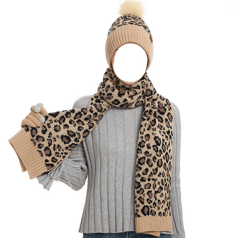 Embrace the colder seasons in style with this fashionable and cozy 3-piece winter accessory set. Featuring a trendy leopard print design across a matching knitted hat, scarf, and gloves, this set provides essential warmth and a coordinated look for autumn and winter.