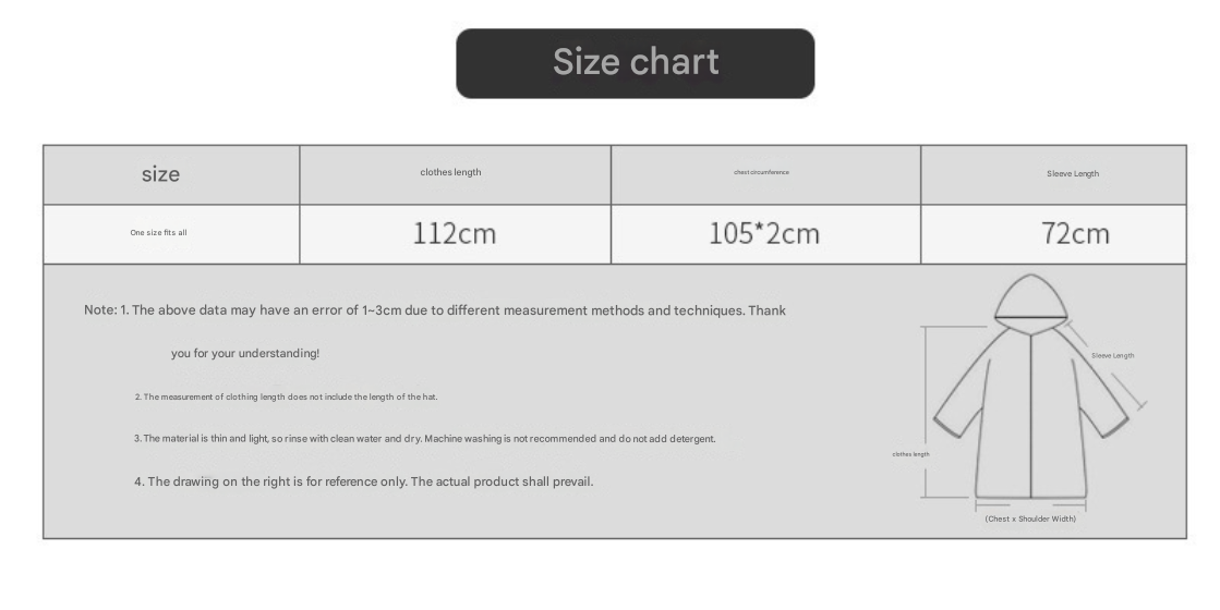 - Extended Length & Coverage: Features a generous long cut (approx. 112cm / 44" length) and wide design (approx. 62" width / 210cm chest circumference) providing ample coverage, even potentially over a small backpack.