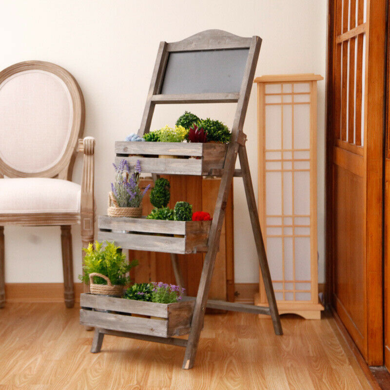 Folding Ladder 3 Tier Plant Stand Garden Flower Pot Holder Shelf with Chalkboard