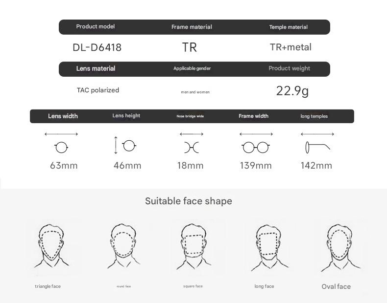 These sunglasses (Model DL-D6418) are more than just a fashion statement. The high-quality polarized lenses significantly reduce glare, making them ideal for sunny days and driving. The lightweight construction (only 22.9g) and ergonomic design ensure they rest comfortably on your face without causing fatigue.