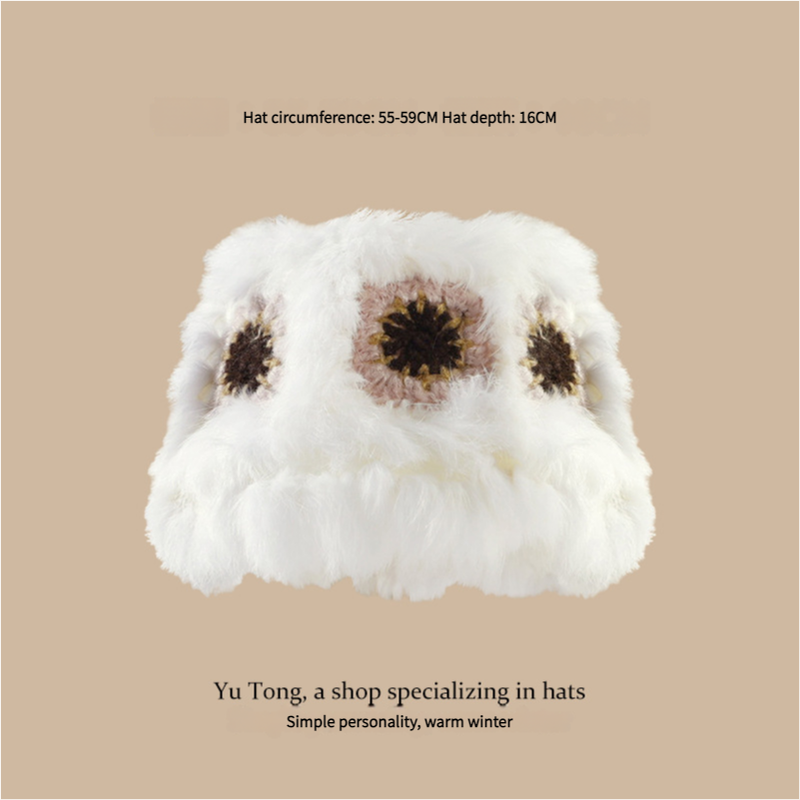Plush Floral Bucket Hat,Warm Crocheted Winter Hat in White Pink-Hat circumference: 56-60cm